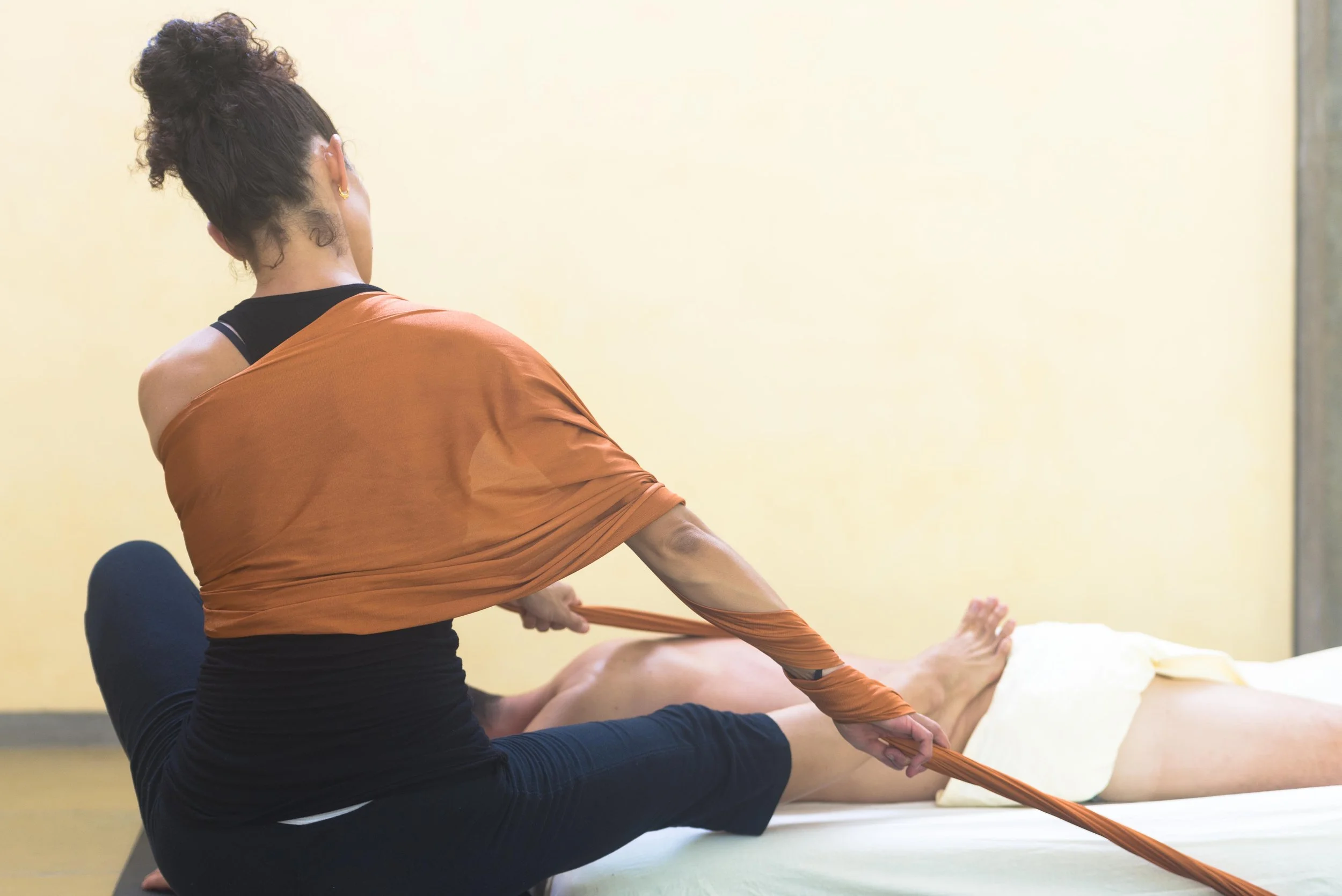 Combinant l'art ancien du massage pieds nus avec la dernière science des fascias, les praticiens de SARGA BODYWORK® utilisent une longueur de tissu attachée à une table de massage pour aider à appliquer des techniques thérapeutiques myofasciales et des tissus profonds avec leurs pieds nus.